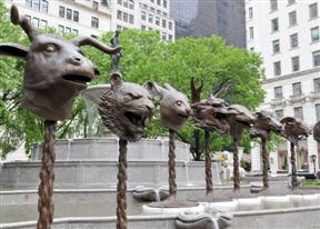 There is a line from West Side Story which sums up one of my little pleasures in life. "Around the corner." I like coming upon an unexpected event, place, or person. I delight in the happenstance of reading a book and discovering the date mentioned is the day I was actually reading. For instance, last Saturday, I started KILLING THE KUDU and cheered when I saw in the opening paragraph, "June 4th." I was reading it on June 4th! On a visit to Nova Scotia, I was strolling down some streets which might or might not be leading to Halifax harbor. I went around a corner and there was a Greenpeace vessel. I was wearing my Greenpeace button! I had no idea the ship was in town, so to speak. I mentioned to Carolyn Meyer I had ordered a copy of WHERE THE BROKEN HEART STILL BEATS and she said, coincidentally, that after twenty years, she was just informed it was being reissued with a new cover. I came around a corner of a path at Central Park and there was my favorite ballerina, all in white doing her, "still" act. She stands motionless until someone puts a donation in her tin pail and then she does a quick, graceful dance and blows a kiss. I didn't have a dollar to throw in but I blurted out, "It's so good to see you!" as though he were my lucky talisman and she winked. I came around a corner and there at the Pulitzer Plaza fountain were the impressive bronze figures of the Chinese artist Ai Wei Wei (last names first in Chinese). He is currently imprisoned in China for supposed economic crimes which as far as I'm concerned is criminal. He is the son of the poet Ai Qing and that poetic quality infuses the statues, especially the Dragon. The following information comes from the NY Parks & Recreation newsletter, The Daily Plant: Full Circle focuses on the inspiration for Ai's current project: the ransacked 18th-century zodiac fountain clock designed by European Jesuits for the imperial retreat known as the Yuanming Yuan (the Garden of Perfect Brightness).